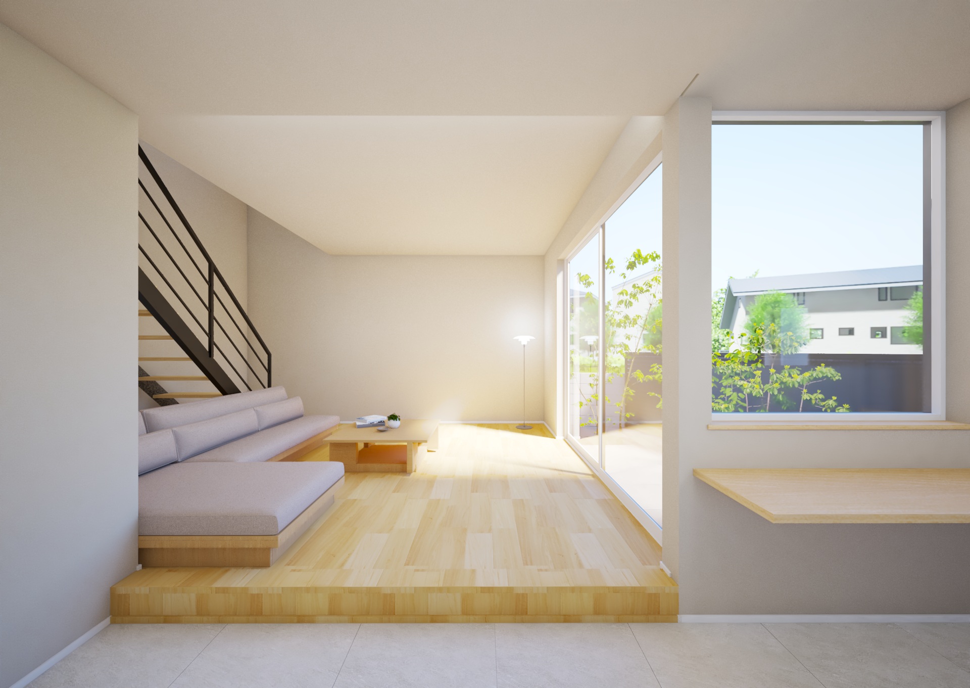 ・スケルトン階段で開放的なLDK。L字型で家族の気配を常に感じられ、子育て世代のご家族も安心。