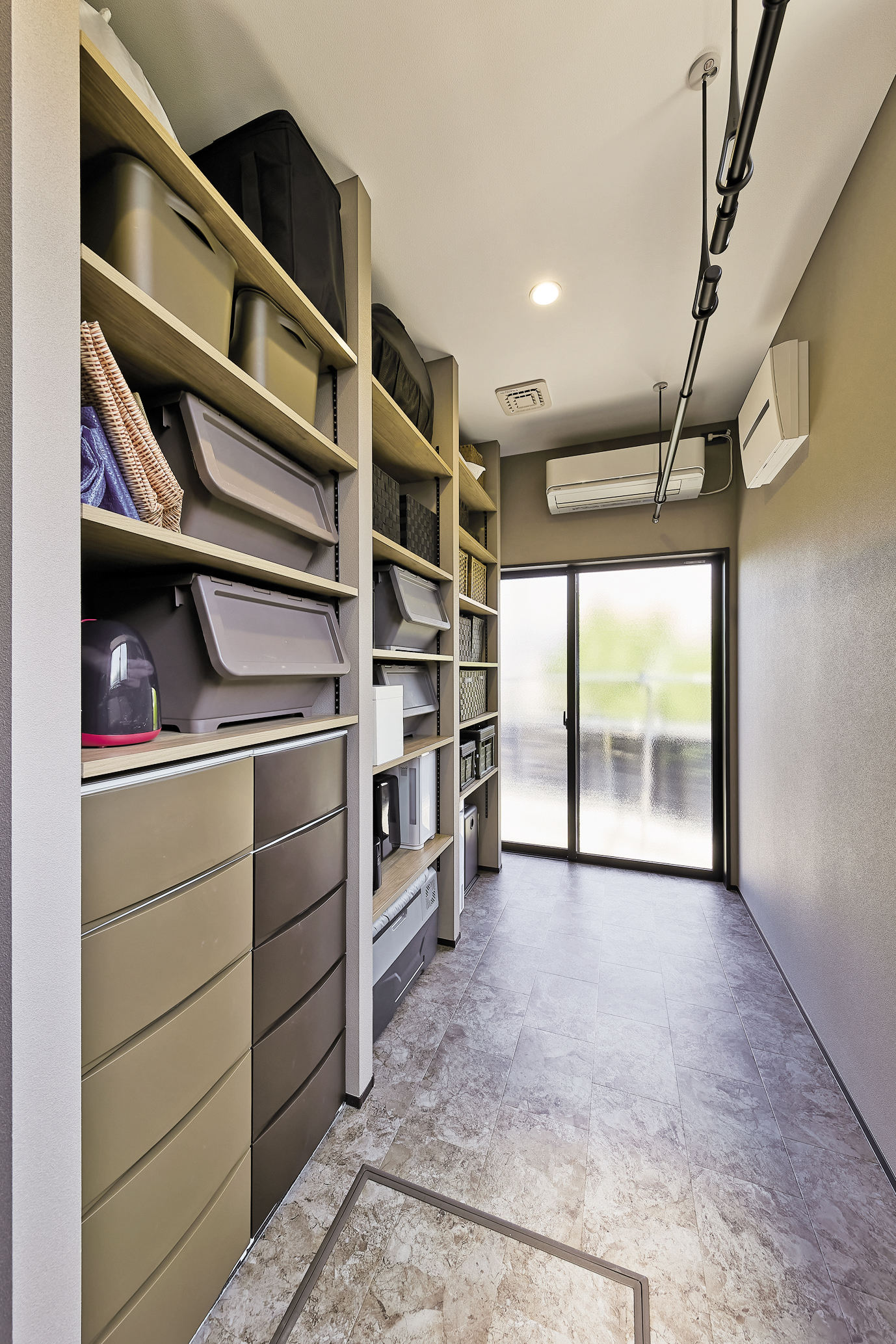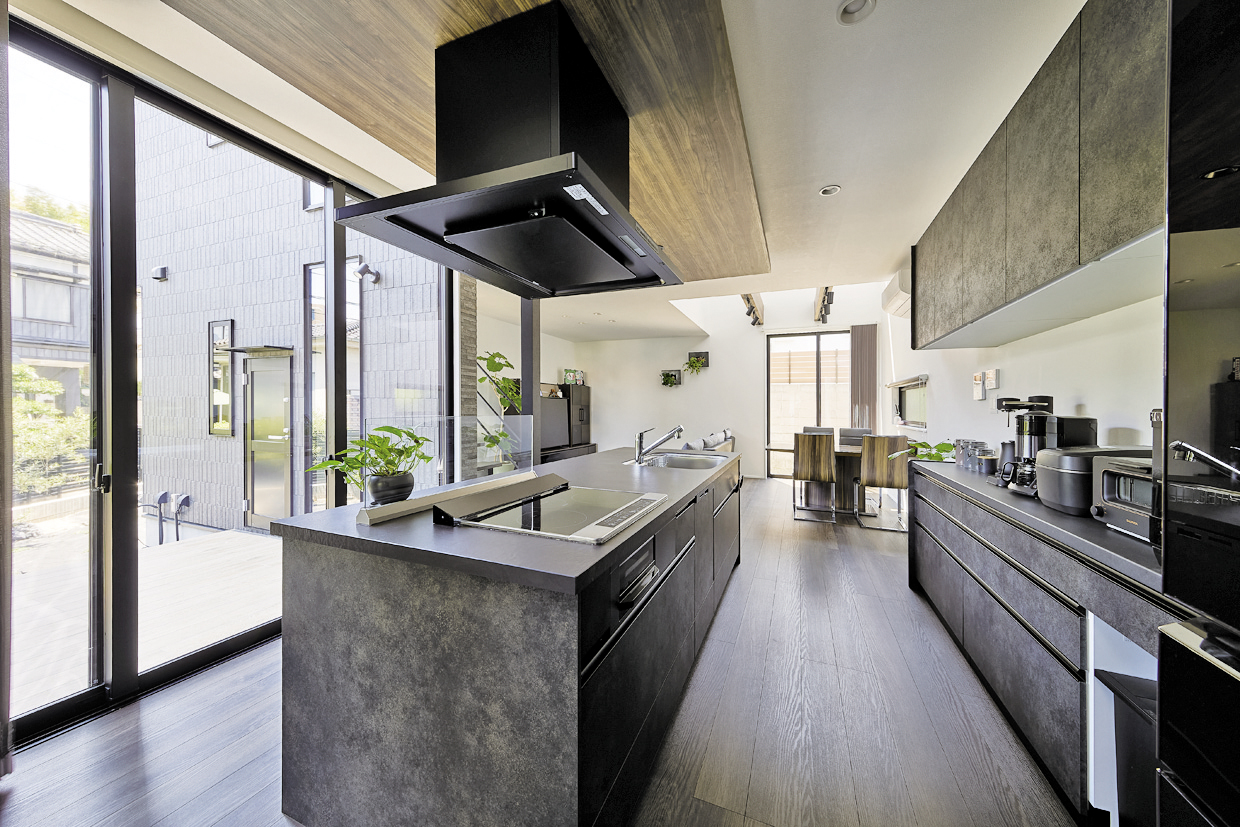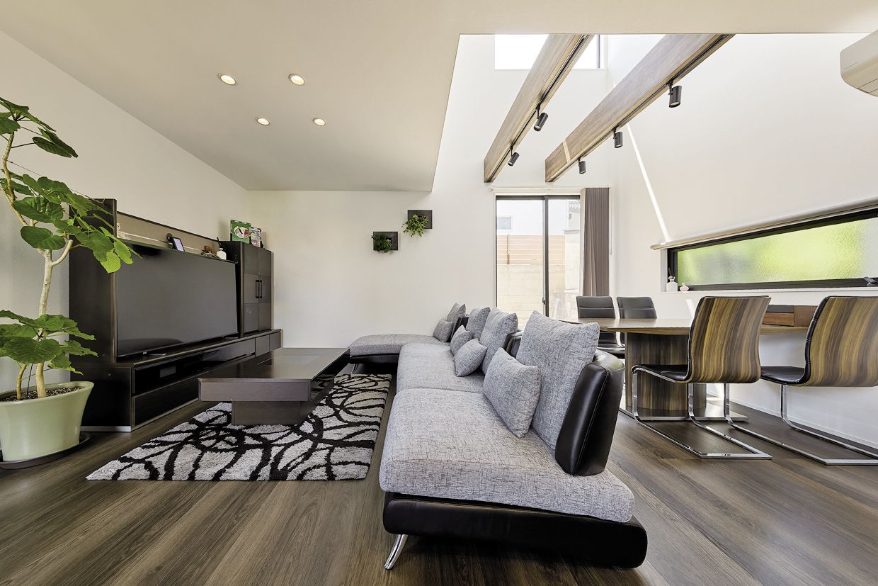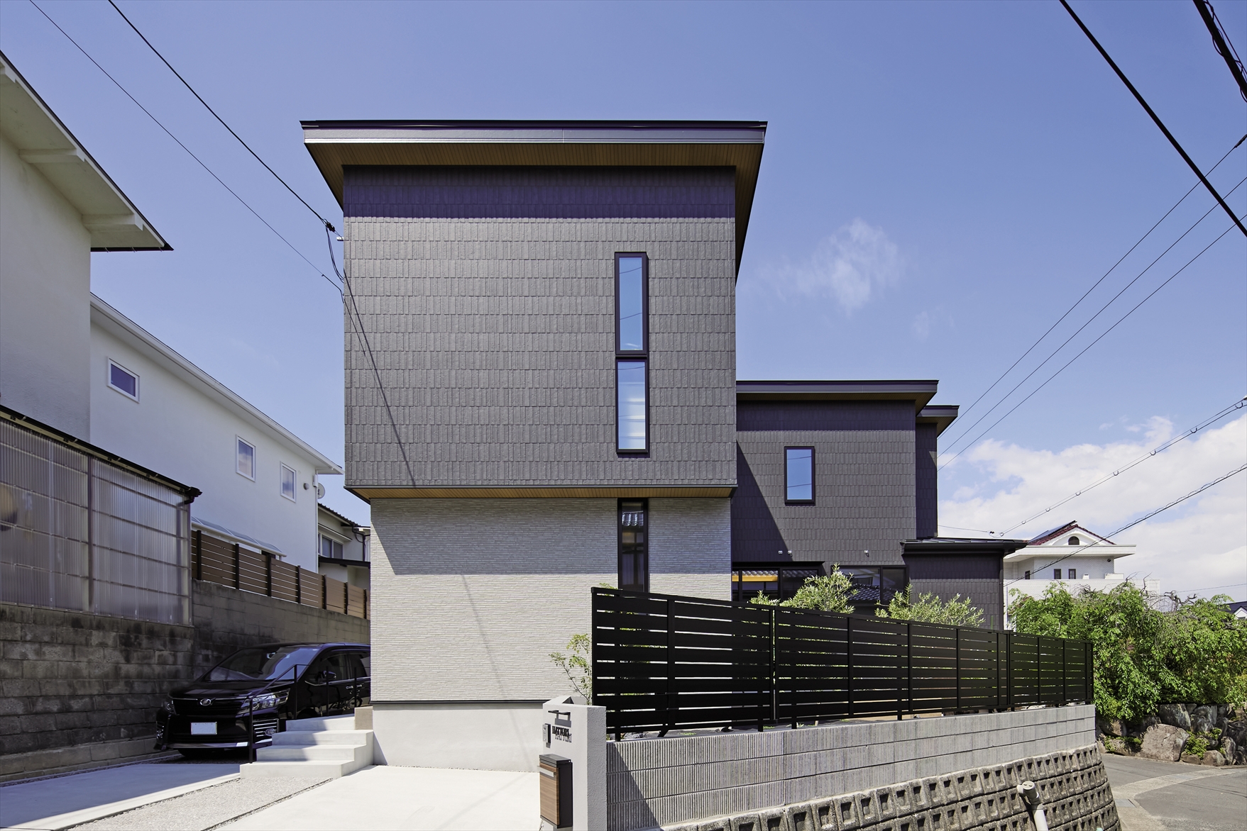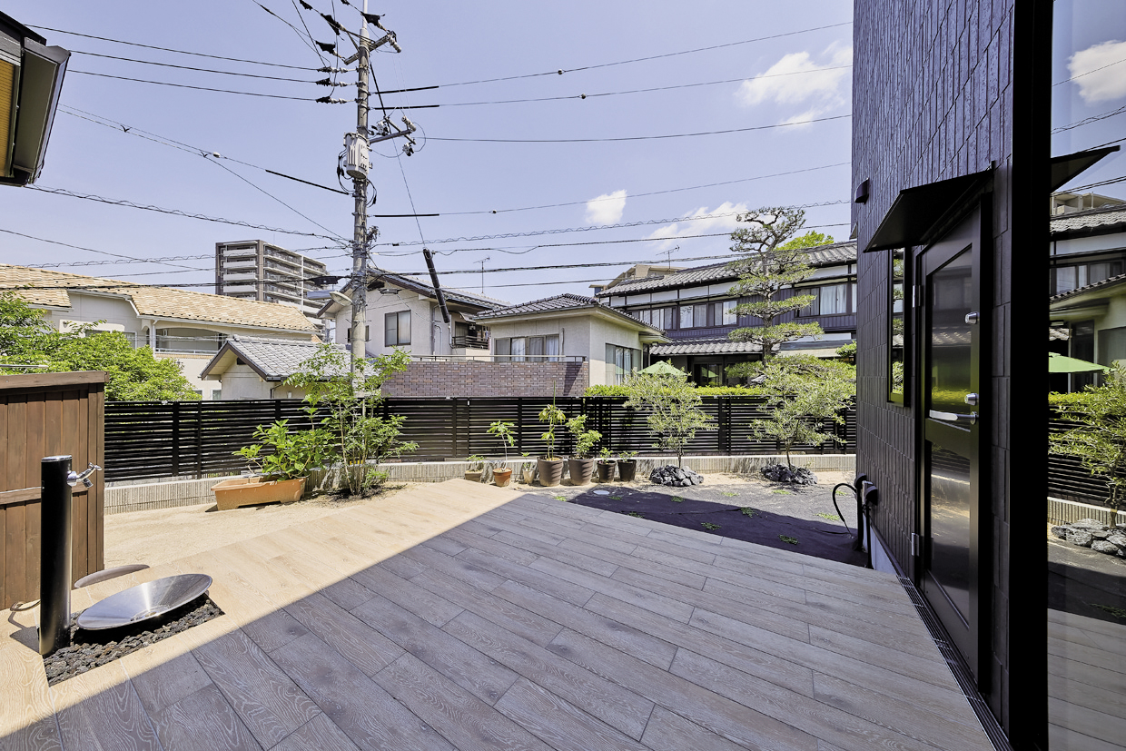H様邸の候補地は、北側道路で道路との高低差がある扇形の土地。加えて、南側隣地が2m近くも高く、古家の駐車スペースは縦列2台分のみという、かなりクセのあるものでした。しかし、その分土地を割安で取得できるため、予算を建物に回すことができ、土地も59坪と広いことなどから、自分が思い描く家を十分に実現してくれるというK様との信頼関係のもと、この場所で家を建てることが決まりました。そのプランは、前庭・家事庭・採光用兼駐車場用の庭と、用途に合わせた3つの庭を設けるというもの。これで扇形の敷地、高台のロケーションが見事に活かされ、「バーベキューができる庭」「1階で完結できる生活動線」など、マンションから住み替えのH様らしい要望もしっかりと盛り込まれた、こだわりのわが家が完成しました。