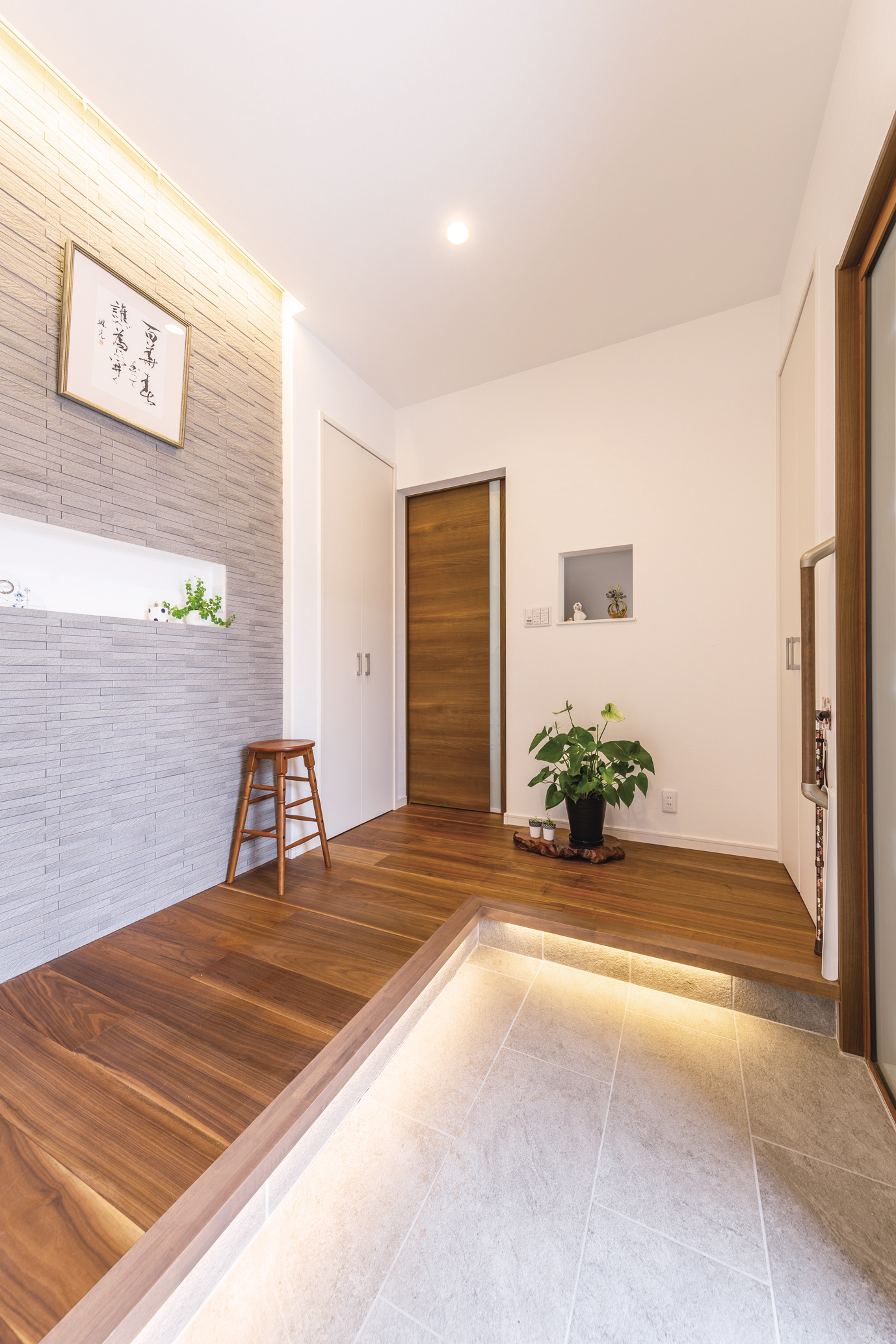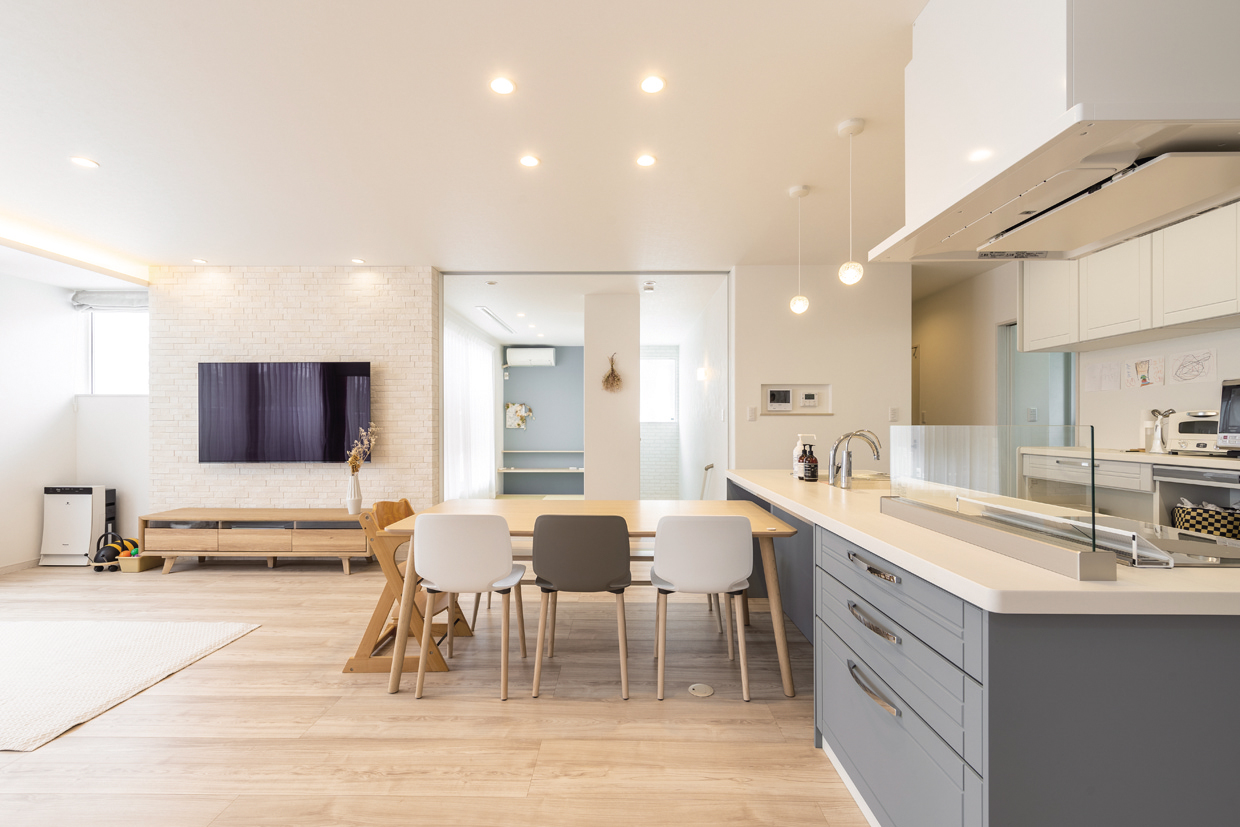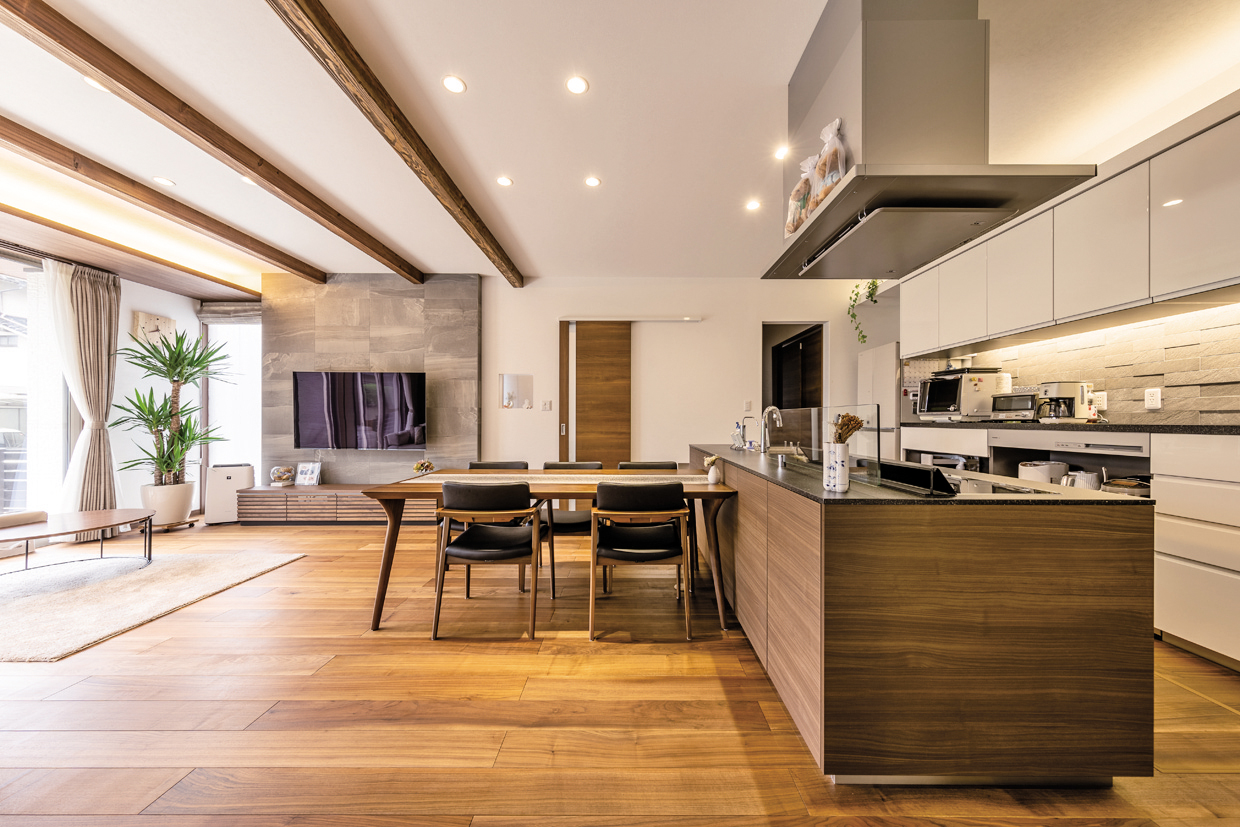 F様邸は、F様夫婦と母親、息子家族の4世代が住む、玄関のみ共用の完全分離型の二世帯住宅。高齢の母親のことを思い、住みやすい安全な家に建て替えたいと家づくりをスタートさせました。互いの暮らしに干渉しないということをコンセプトに、家族が適度な距離感で、適度な関わりを持つことができるよう、オーソドックスな上下階で分ける横割りプランを選択しました。お互いの生活音がストレスにならないように防音対策も行い、部屋の配置にも気を配りました。重量木骨工法の家は、高気密・高断熱で、冬はほとんどエアコンを使わないほど暖かく、耐震性も高くて安心。家族の家事動線や母親の生活動線もスムーズで、収納スペースも豊富。4世代みんなが日常的に楽しく集まって、長く安心して暮らせる住まいです。